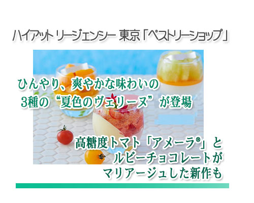 | ハイアット リージェンシー 東京のロビーフロア・2Fにある「ペストリーショップ」に、この夏、目にも涼しげなグラススイーツ「夏色のヴェリーヌ」3 種が新登場、7月1日(水)から9月22日(火・祝)までの期間限定で提供されます。 |