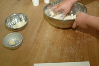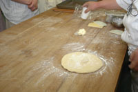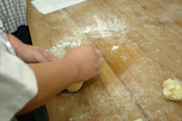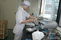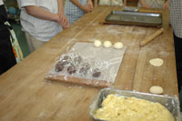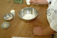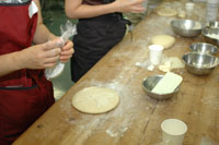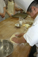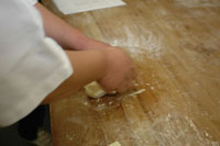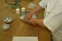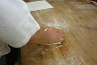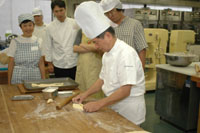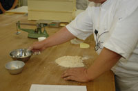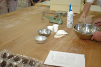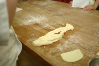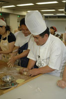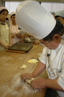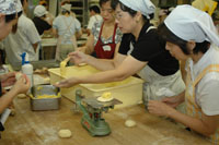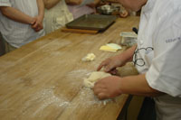 材料を受け取り、テーブルで実習が始まる。バターが入る生地は扱いが難しく、大変な作業でした。