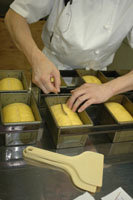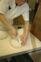 この後 型へいれ二次醗酵 ホイロへ 真剣な表情でクープをいれる武藤チーフ