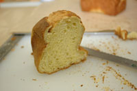 窯からは、焼きたてのパンが出てきます。食パン、ブリオッシュ生地のパン、焼きたての大きなパンを惜しげもなくカットする