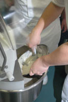 、11:00から全員で中種法による、バターを配合する生地作りを勉強。手の使い方、生地の見方、Webで見られ
