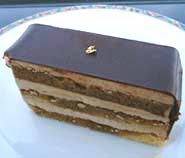 オペラ ¥280 上からそっと押すだけで、じわーっと染み出すほどたっぷりトラブリ(コーヒー味)のシロップがうってある、すごくしっとりしたオペラ。バタークリームとコーヒーの味わいがまったりした上に、ビターのチョコレートの味が加わって、とても美味しい。 |