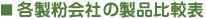 ![]() 各製粉会社にどのような製品があるか知りたいと思ったことはありませんか?そこで、東京製粉からいただいた「製品マーク比較表」を参考に、各社がだしている製品を表にまとめてみました。 |