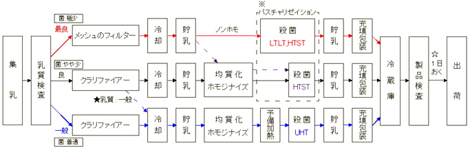 *メッシュのフィルター : ステンレス線であんだふるいに通して、細かいゴミを取り除きます。脂肪球が壊れることはありません。 *クラリファイアー : 遠心分離機の力によって、細かい塵やゴミを取り除くことをいいます。これにかけると脂肪球も壊れるのでノンホモ牛乳を作るのには適しません。 ★良質の生乳を遠心分離機にかけると、外側の部分に集まった一部の生乳の乳質は一般となるため、高温殺菌されます。 ☆製品検査の後は菌の繁殖テストを行うため、必ず1日おいてから出荷されます。これは厚生省で義務づけられていることなので、牧場などで飲める「搾りたての牛乳」というのは本来日本ではありえないことなのです。 ※パスチャリゼイション:フランスの細菌学者パスツールが発見した熱処理法で、60℃程の加熱殺菌をすること。素材の風味を損なわずに殺菌できるので、いろいろな食品の殺菌に使われている。LTLT、HTSTの二つの殺菌方法がこれにあてはまり、それらをパスチャライズ牛乳(パス牛乳)とよんでいます。 |