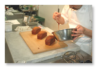 6.型へ流したら、型の長い方の両サイドをゴムベラでならし、センターにバターをコルネで少量絞り筋を入れる。これは、焼き上がりで上の生地がしっかりと割れるようにするため。 7.170℃で、40分。ときどき様子を見ながら焼成。通常のケークより焼き色が少し濃くなります。 |