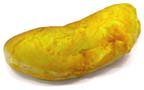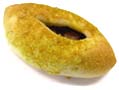 揚げてないカレーパン 200円 黄色いカレー粉が表面にまぶしてある。カレーはチャツネの甘酸っぱさが決め手のマイルド系。生地はソフト、形も口にすっと入るロングタイプ、やわらかいルーが飛び出さず食べやすい。 |
