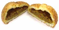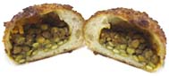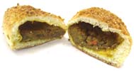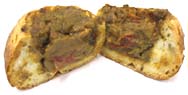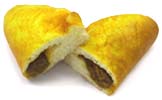 焼きカレーパン 大辛 140円 キョーレツに辛い! と思ったらなかから刻んだ青唐辛子が出てきた。今回試食したなかで1、2を争う辛さ。生地が割と甘めなのと、コーンやニンジンなど具だくさんなのが救い。 |