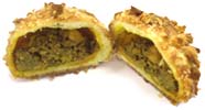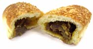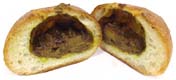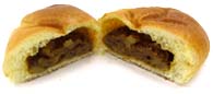 焼きカレーパン 普通 140円 黒胡麻トッピングがカンガルー流。このパン、辛さは普通となっているがむしろ甘口。タマネギとトマトがカレーを心安らぐ味に仕上げ、それが薄くてソフトで甘めの生地に包まれている。 |