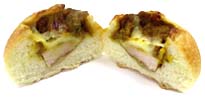 チキンカリーフランス 200円 このカリーのチキンはただのチキンではない、なんとスモークチキンなのだ。しかもどっさり入ってボリュームも申し分なし! 生地はフランスパン、チーズのトッピングがいかにも欧風。 |