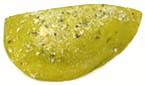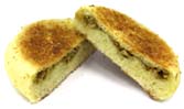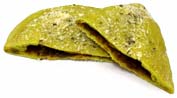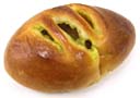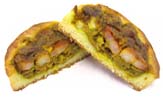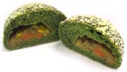よもぎのカレーパン 130円 生地に練り込まれたよもぎのグリーンが鮮やかなカレーパン。具が少なめなのが残念だけど、よもぎパン生地にもスパイスが含まれているのだろうか、ほんのりピリッとくる刺激がある。 |