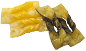 ![]() 詰め合わせの中で最も小さく、愛らしさを添えている菓子です。この結び方は日本でも、お正月のこんにゃくや昆布などでおなじみですね。練った小麦粉を薄くのばして形を作り、揚げてから水飴と五色の彩を添える材料の風味をつけたものです。ちなみにチファジャでは黒は赤米(もしくは黒米)を、赤は五味子(韓国で採れる甘酸っぱい実)を、黄色は柚子の風味をつけていました。カリカリとスナック感覚でいただける軽いお菓子で、ちょっと遊び心もある、こんなお菓子もあるのが宮廷菓子らしいですよね。貴族の子供達が食べていたのでしょうか。 |