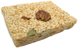 ![]() これは前述した強精(カンジョン)と同じ栄養満点の菓子の部類に入るもので、見た目は私たちが普段なじんでいるおこし風の菓子とホボ同じです。黒ゴマや白ゴマ、韓国らしくエゴマや松の実、大豆やピーナッツなどを香ばしくカリカリに炒ってから砂糖と水飴を加え、即座に練り固めたものです。中でもきな粉の風味が口いっぱいに広がる大豆おこしの素朴なおいしさには驚きました。そのほか黒ゴマといい、どれも内側からにじみ出るような、素材の持つ自然な甘さに好感が持てました。 ただし歯ごたえは日本のおこしのようにカリッとしておらず、しっとりと粘り気を感じさせるものでした。しかし、かえってそれが口の中全体に風味を伝わりやすくし、味わいを増しているように思えました。滋味深い味とはまさにこのこと、といった菓子です。 | ![]() |