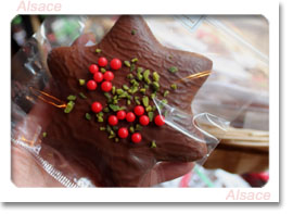 左のキューブ状のお菓子は、ギルグのもの。ノエルの時期に見つけたのですがパンデピスの間にノエルのコンフィチュールをサンドし、ショコラでコーティングした冬の香りが詰まったとっても素敵なお菓子。またぜひリピートしたいお菓子です。 中央はショコラというかココアを使ったお菓子ですが、アルザスの定番焼き菓子「ケーク・エコセ」。ミュールーズのパティスリージャックのものです。ココアとアーモンドが主役の風味豊かな焼き菓子。日持ちがするのでお土産にしても喜ばれます。 右の可愛い星型のお菓子はメゾン・フェルベールの「パンデピス」。 乾いたタイプのパンデピスにショコラをコーティング。クリスマスらしく赤と緑で賑やかな仕上げが可愛らしい!食べるのがもったいないくらいですね。 |