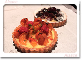 特に初夏はたくさんの種類のフルーツが並びます。 最近は日本でもフランスのフルーツが冷凍品で入手出来ますが、やはりフレッシュのフルーツの持つ力強さは違います。ひとつつまみ食いしたくなる衝動に襲われそうな輝きです。 日本のものよりこぶりなりんごや、イチゴやラズベリー、モモ、グロゼイユやカシス、ミラベル、アプリコット、ルバーブ等、どれもがいきいきして、美味しそうです。 これだけフルーツが豊富なので(しかもお安い!)、アルザスのお菓子はフルーツをつかったものがおおいです。 今回はアルザスで食べたフルーツのタルトを紹介して行きたいと思います。 |