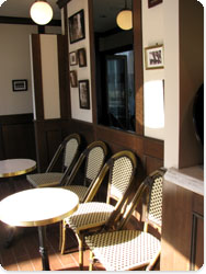 | さらに、おすすめは奥のカフェスペース。オープンカフェのスタイルになっていて、明るい陽射しの中でケーキや飲物を楽しむことができるのが魅力です。メニューには、長島シェフおすすめのショコラショーやアルコール類もあるので、ちょっと帰りにヴァン・ショーとショコラ! なんていうこともできちゃいますよ。 |