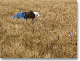 ところで、今年は無事豊作だった麦畑ですが、なぜか一部が倒れています。これは風や雨の影響なのでしょうか? 「実は、昨年ここでキャベツを育てていたんです。まだ土に肥料が残っていたのか、ちょっと育ちが良すぎて・・・」 栄養たっぷりならより小麦ができそうですが、栄養過多になると倒伏するなどのマイナス面も。こうなってしまうと、大変なのは刈取り作業。コンバインが穂をうまくつかめないため、人間が手で穂を起こし、そこをコンバインで刈りとるという面倒な作業が必要になってしまいます。 |