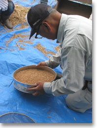 脱穀機を終えた麦は、まだ、殻、麦粒、野毛などが混ざっている状態。 そこで、粗いふるいにかけ、大きなものを取り除きます。 |