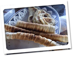 | 「薫々堂」さんの食パン生地で、ピタパンとくるくると棒に巻きつけて焼き上げた棒パンを作りました! |