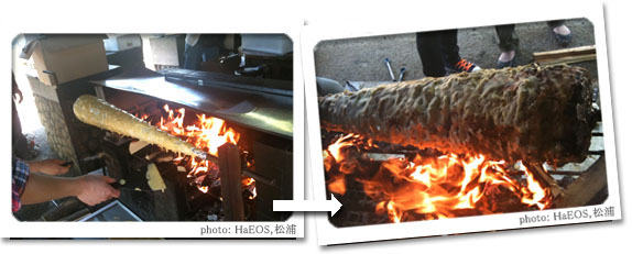 さて、肝心の「ガトー・ア・ラ・ブローシュ」の作業工程ですが・・・ 最初は、薪火の手前に芯を置いていたのですが、どうも火の通りがうまくいきません。 どうやら焼き時間も長いようだ・・・と、いうことで、途中から、“直火”に変更。 すると、ぐんぐん「ガトー・ア・ラ・ブローシュ」が成長するではありませんか! 途中、この大量の生地を、2回ほど女子グループが、“腕に力(?)”をかけて作成。 生地も完全に“人力”で作っています・・・ |