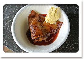 | さらに赤いストウブ鍋でちょっとしたデザートも作ります。マンゴーにクリームチーズを散らし、トロピカルフルーツのソースと蒸し焼きし、熱々のところにマンゴー&パッションフルーツのソルベをトッピング。まったりマンゴーとバナナに、きりっと冷たいソルベの酸味で瞳孔がパチリ! 正直、BBQ場で食べるレベルを超えています。 |