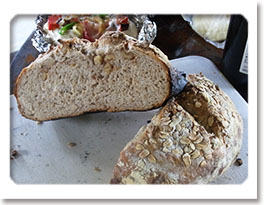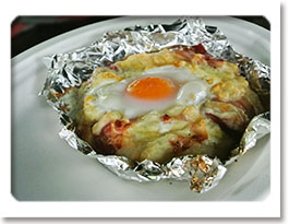 薪火と炭でじっくり熱を蓄えさせ、参加メンバーの松浦さんが仕込んできたカンパーニュ生地をそっと入れ、待つことおよそ20分。「わっすごい!」、見事な焼き上がりに歓声が沸きます。野外にもってこいの牛乳パック食パンもナイスアイデア! 続いて、三宅さんの仕込んだピッツァ登場。ふるふる卵がのっかったビスマルクもこの通り! さすが、パナデリア(スペイン語でパン屋の意味ですから)主宰です。 いやいや〜、たったこれだけの仕掛けで本格的なパンが焼ける驚き、感動ったらありません。ありがとう、櫛澤電機さん! |