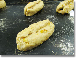 イエス・キリストのおくるみの姿をあらわしたとも言われるシュトーレン。その成形には色々な方法がありますが、今回は型入れと手成形の2種類で作ります。 「型成形の場合、少し詰まってきめ細かい食感になります。均一なボリュームに焼き上がるのも利点ですね。一方、手成形の場合は、少しボリュームが出て、ふんわりとした食感になります」 最近、増えているのが型を使ったシュトーレン。見た目も美しく、個体差がないので、お店では重宝するようです。 |