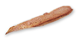 生ハムフランス \252 大胆に縦割りしたバゲットの表面に薄く塗られたのは、サン・ダニエーレ産の生ハムと生クリームで作ったムース。ムースのキリッとした塩けと濃厚な味わいが一口ごとに口の中に広がり、軽めのバゲットとも好相性。トーストでこんがりと焼けば、さらにハムの味が引き立ちます。 |