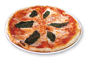 ピッツァ マルゲリータ \693 カフェメニューのピッツァはマルゲリータ、5種類のチーズ(\693)、バチルチキン(\735)の 3種。パン屋らしい味を目指し、36時間以上寝かせた生地を、オーダーが入ってから300℃の石窯で焼き上げるという、こだわりの一品です。薄めの生地はモチッとした食感。トマトソース、チーズたっぷりのジューシーな味わいです。 |