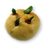 フォッカッチャ(トマトバジル) ¥180 トップにちょこんとのった、トマト&バジルの赤と緑がかわいらしい。少量ながらも、酸味と甘みが凝縮したドライトマトとバジルの香りが効いています。ふんわりと弾力のある質感の瑞々しい生地は、ナポリッピッツァのよう。オリーブオイルと合わせて食べたい。 |