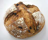 レーズンカンパーニュ (500g) 480円 香りのいいレーズンの甘みと生地の旨みがあっている。カンパーニュより軽い感じでクセがないので、天然酵母初心者でも大丈夫。これもクラストの香ばしさがうれしい。 |