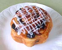 パン・オ・レザン 140円 デニッシュ生地の中にカスタードとレーズンが入っている。上にかかっているアイシングが、甘みのコクを加えている。 |