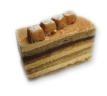 キャラメルと塩のオペラ \441 印象的なのは、きめ細かくシャープな口どけのバタークリーム。キャラメルのほろ苦さのなかに、塩がしっかりと効いた力強い味わいは、ガナッシュとの相性もよく、生地からジュワッと染み出るコーヒーの風味が最後に余韻を残します。上に飾られたサブレのザクザクッとした食感も楽しい。 |