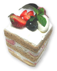 夕張メロンのショートケーキ ※ ¥380 カットしたところにたっぷりのクリーム。そしてジューシーなメロンが爽やかにしめくくります。上に薄くかけられたミルクゼリーもポイント。 |
