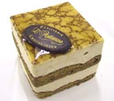 ピスターシュ ¥380 一番上にはピスタチオの濃厚なムース、そしてピスタチオプードルの生地、アーモンドのムースからなっています。ピスタチオのムースがとても色鮮やかで、ピスタチオやナッツの美味しさが小さな一つのお菓子の中に凝縮された感じです。 |