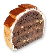 ハンプ \350 ブラウニーのような目の粗いどっしりとしたチョコレートケーキに、口溶けの良いチョコレートガナッシュをサンド。ナッツとオレンジピールで食感と香りをプラスし、広く好まれる味わいのチョコレートケーキに。 |