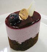 ブルーベリーのムース 360円 ブルーベリーのムースとココアのスポンジから作られているケーキ。ココアスポンジにはアーモンドエッセンスが入っていて口の中で、優しい風味が広がります。ブルーベリームースは濃厚なしっかりとした味わいです。 |