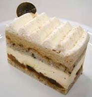 パルテノン 320円 ショーケースの中でも一際、目をひくケーキです。柱の部分はシュー生地で、シューの中はヘーゼルナッツの香ばしいクリームが入っています。上下にサンドしているビスケットもしっかりと焼き込まれていて美味しい。 |