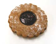 リンツァーアウゲ 180円 こちらもスパイスのほどよくきいたサクッとしたクッキー生地で、しっかりと焼いてあります。スパイスとラズベリージャムの酸味とのバランスが良く、美味しい。 |