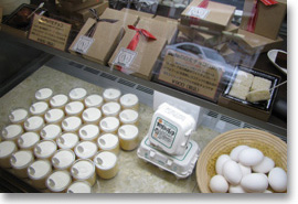 中央の棚には焼菓子やコンフィチュール、冷蔵ケース にはプリンやチョコレートとスイーツが充実 |