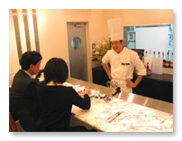 「別に奇をてらったわけではないんです。僕が得意なデセールを一番いい状態で食べてもらうにはどうしたらいいのか。そのためには、お客様を見渡すことができ、できたてをお出しできるカウンターが一番だと考え、自然とこういう形になりました」 こう話すのはシェフの鎧塚俊彦さん。ベルギーの三つ星レストランで日本人初のシェフパティシエを務めたという輝かしい経歴の持ち主だ。2004年9月のオープン前から周囲の注目を一心に集めていた。そんな今話題のシェフはどんな道のりを歩んできたのだろう。パティシエとして歩んできた歳月や菓子にかける想いを語っていただいた。 |