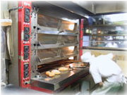 20年を経て、機械も大分古くなってしまいましたが、どうぞ厨房を見てください。入ってすぐ右にあるのがフランスパンを焼くためのボンガードオーブンです。窯から出したばかりのフランスパンに耳を傾けてください。パキパキという音がするでしょう。わたしはこれをパンの歌といいます。焼きあがった時にこの歌を歌っているのがいいパン。失敗すると歌ってくれません。フランスパンの皮は薄く強くが基本。中の白い部分をしっかり守るのが役目です。ホテルにも卸しているので、1日120本、多い時で300本くらい焼いています。 |