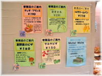 店長 磯貝恵美子さん 素材選びにはいつも悩まされています。極力いいものを、かつ日々安定して使い続けられるものをというと、なかなかこちらの希望するようなものは手に入らないんです。ハード系のパンを中心にやりたいというのは、パン屋なら誰もが思うことでしょう。でも、地元のお客さんのニーズに応えたパンを作るのというのが第一。惣菜パンなしでやるというのは難しいですね。ただやるからにはできるだけ身体にいい素材を、そして全て手作りで、というのがこの店の基本です。豆や発芽玄米など健康に気をつかったもの、季節感を取り入れたものはお客様にも喜んで頂いています。ポップを作って効果などを書いているんですよ。 |