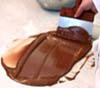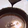 テンパリング方法 ●冷水溶かしたチョコレートの入ったボールを、冷水につけて温度を下げます。湯煎もしくは直火にかけて再び加温します。 *冷水につけるとき、水が入らないように気をつけます。 *湯煎にかけるときは湯気が入らないように小さめのボールにお湯をはるようにします。 また、直火で温める場合、チョコを焦がさないよう気をつけます。3秒くらいで火か らはずして攪拌し、ボールの熱をチョコにうつすようにします。 ●マーブル台マーブル台の上に溶かしたチョコレートの2/3〜3/4を流します。時々パレットナイフなどでまぜながら、温度を下げます。 温度が下がりもったりとしてきたら元のボールに戻しいれ、良く攪拌して全体の温度を下げます。 再び加温します。 ●チョコレートを加える溶かしたチョコレートの中に、刻んだチョコレート又はタブレット状のものを加えて溶かし、温度を下げます。再び加温します。溶かした熱いチョコレートを加えて温度を上げることもできます。 |