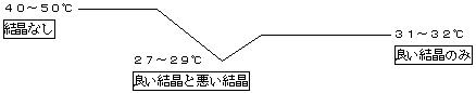 チョコレートの分類 チョコレートが、滑らかな舌触りと常温(18〜22℃)では固いのに口の中で溶ける、という性質を持っているのは、ココアバターの科学的性質によるものです。ココアバターは常温(20℃)までは固い固体であるが、28℃以上から溶け始め、34℃以上ではすっかり溶けて液状になります。ココアバターには6種類の結晶型があるといわれています。ローマ数字でT型〜Y型と表現し、そのうち安定した結晶はX型になります。テンパリングとは、ココアバターの結晶を安定した型に統一するために行う温度調節のことです。 ココアバターを単に溶かして固めただけでは、光沢のないざらついたものになります。これは、不安定な結晶が溶けたり固まったりしながら結晶化していくため。これを温度調節によってX型の結晶を作り、結晶がきれいに詰まった配列にすることによって、光沢のある滑らかな口溶けを持つものにします。 |